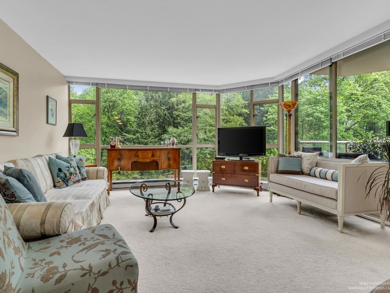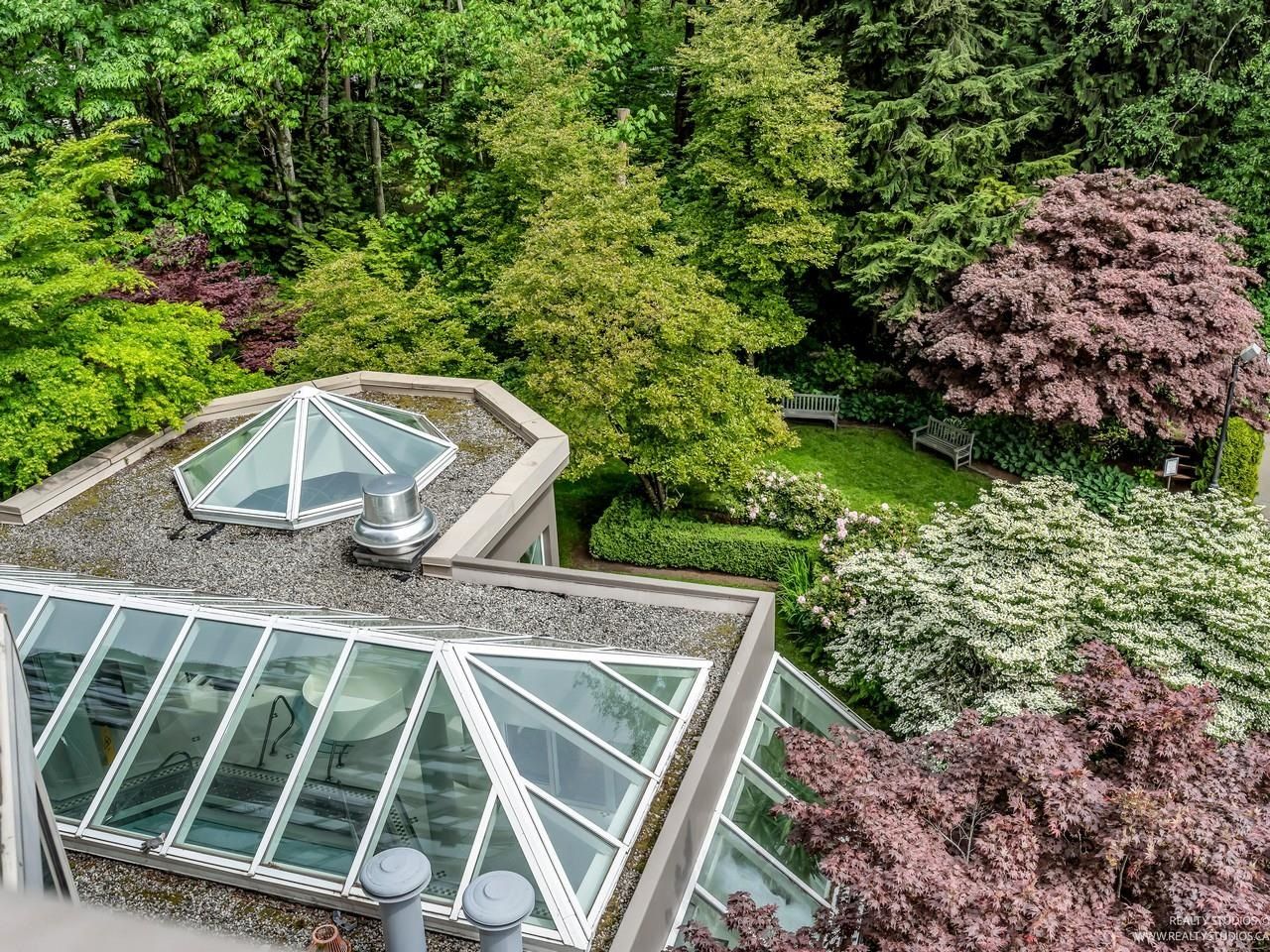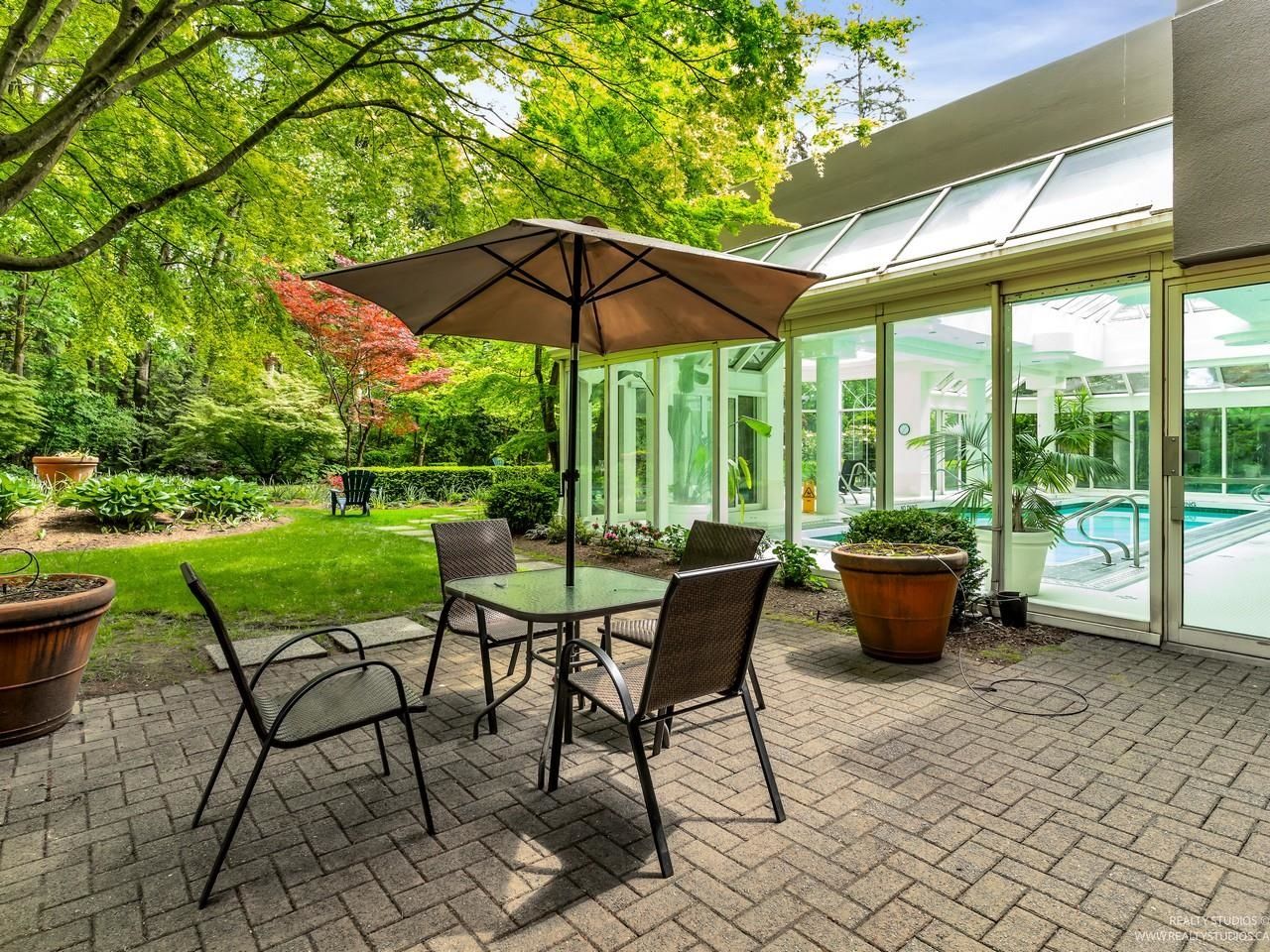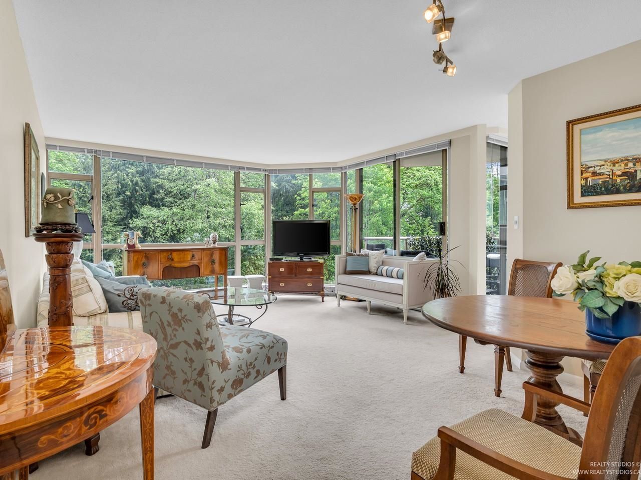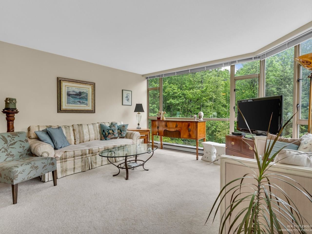Welcome to one of the Most Desired Buildings on the North Shore. The Carlton at the Club offers resort-style amenities including a grand elegant lobby entrance with a large fireplace, indoor pool, hot tub, sauna, exercise center, library, party room, work shop, theatre, billiards room, card room, guest suite, onsite caretaker, and a private garden. This home boasts 792Sqft living space, floor-to-ceiling windows, in-suite laundry, and a Large walk-in closet off the primary Bedroom. The large functional layout offers a beautiful quiet treed exposure, covered balcony, and large living spaces with plenty of storage and built-ins. Just minutes from shopping, groceries, restaurants, and services. 1 parking, 1 storage included. A pleasure to show.