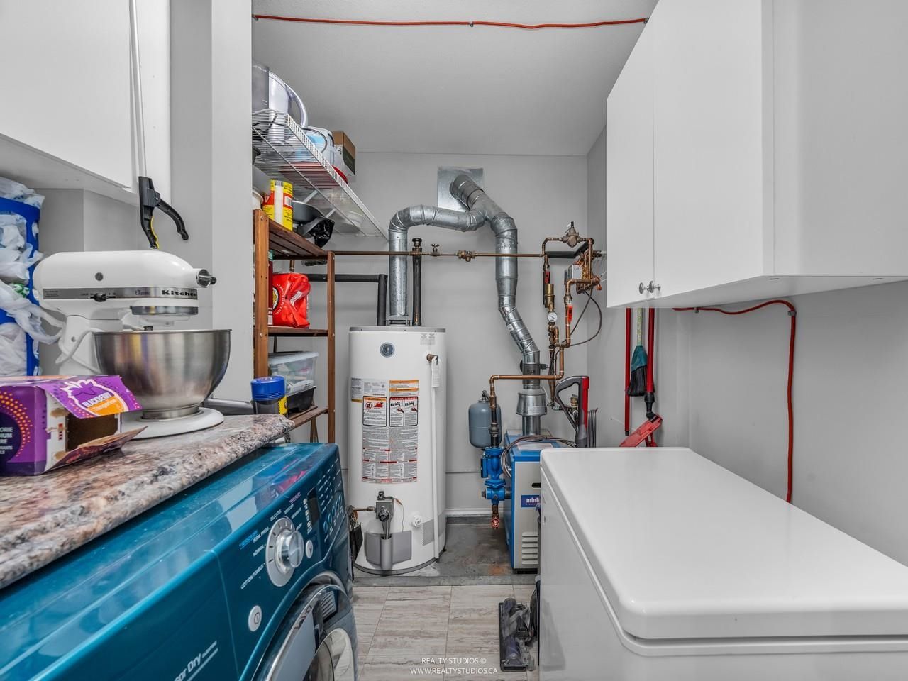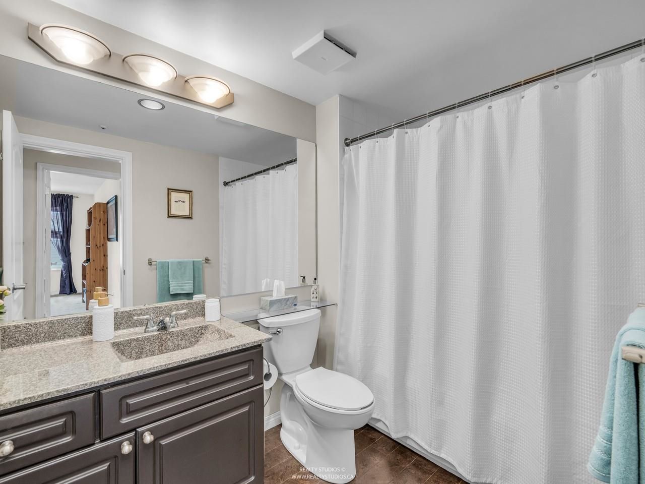 TOP FLOOR - PENTHOUSE LIVING - LARGEST UNIT IN THE BUILDING. Located on the quiet side of the building facing the Greenbelt and Creek, This home boasts OVER 1400 sqft and features Vaulted ceilings and a grand open-concept living space flooded with natural light, large covered balcony facing the Greenbelt, Updated kitchen, Gas Fireplace, Crown mouldings, 2 Large Bedrooms, Primary with 4 piece ensuite and 2nd bedroom is equipped with a built in murphy bed. 1 parking 1 Storage locker, minutes to Shopping, Restaurants and Transit / Future SkyTrain station.