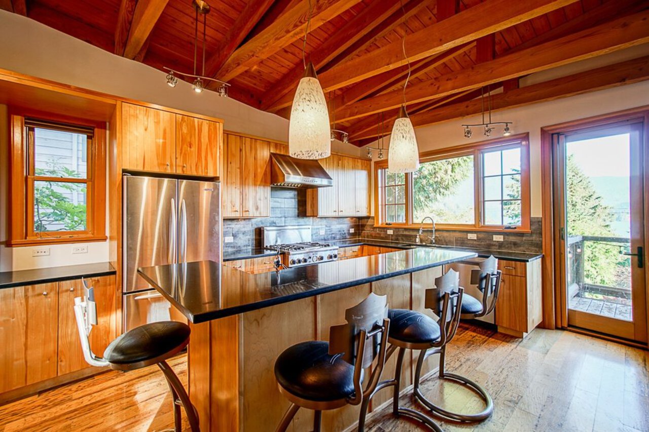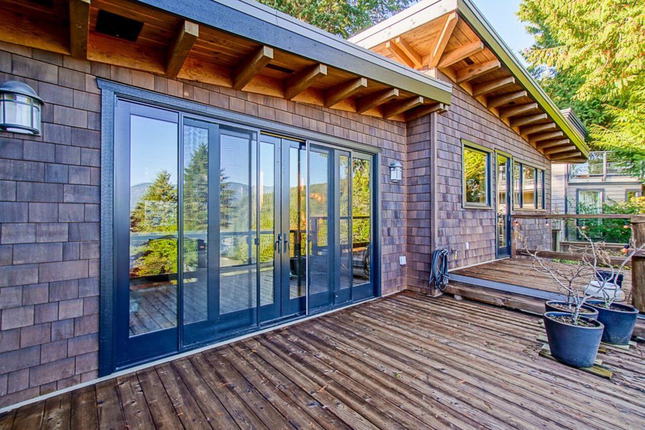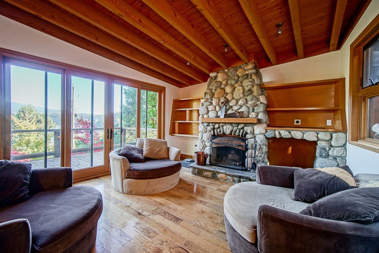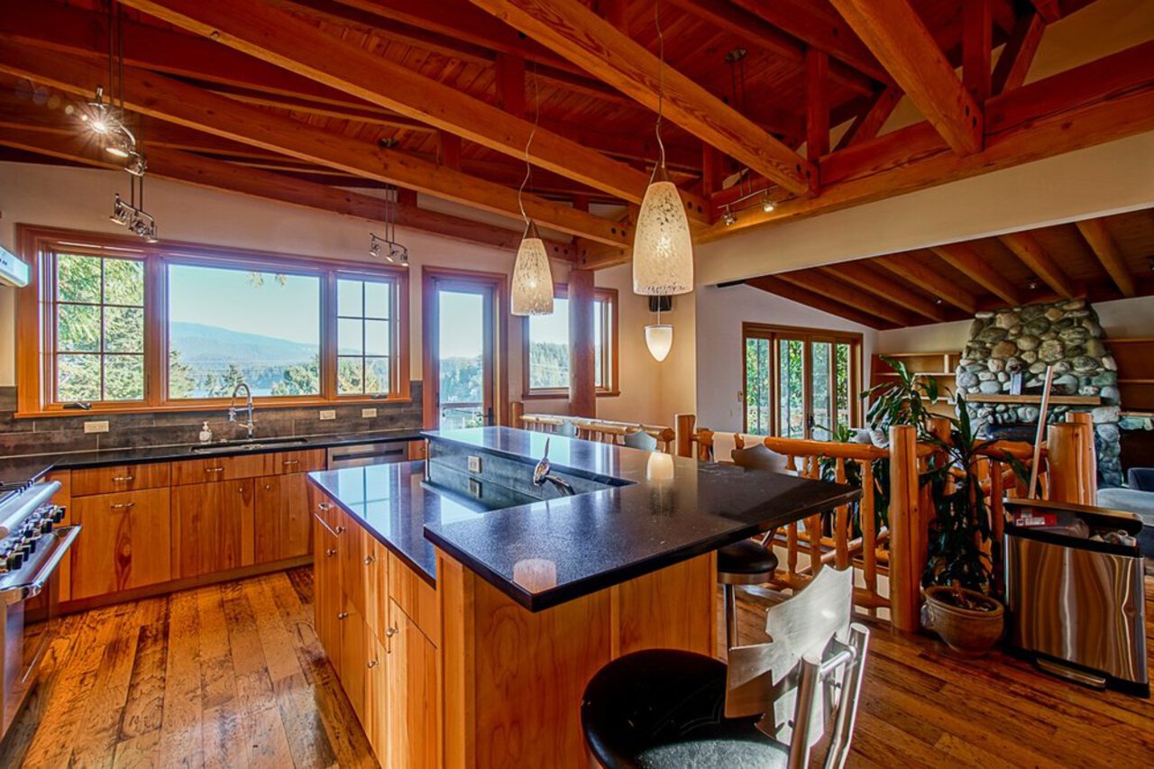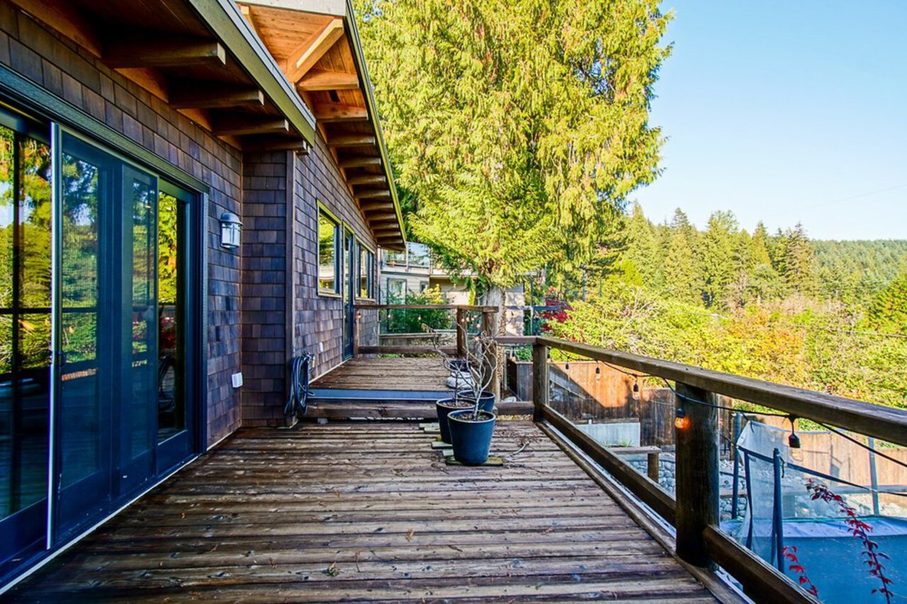This custom built OCEAN VIEW home was completed in 2006,features 4 bedroom&3 bathrooms facing E towards Deep Cove Village. This home features an exposed open wood beam ceiling, 2 river rock wood burning fireplaces, gourmet kitchen with stainless steel appliances, gas range, island with granite counters, lots of custom built in cabinets and seating, a large balcony off the kitchen perfect for bbq&entertaining, gorgeous wood flooring, open plan living/dining, 3 bedrooms up, The Master with walk in closet and luxury ensuite facing the open courtyard with hot tub. Downstairs features another bedroom, 3 piece bathroom&family room with access to a large entertaining area outside above the garage. Bonus workshop down with 2 car garage, minutes to trails, Deep Cove Village, transit and the Beach.