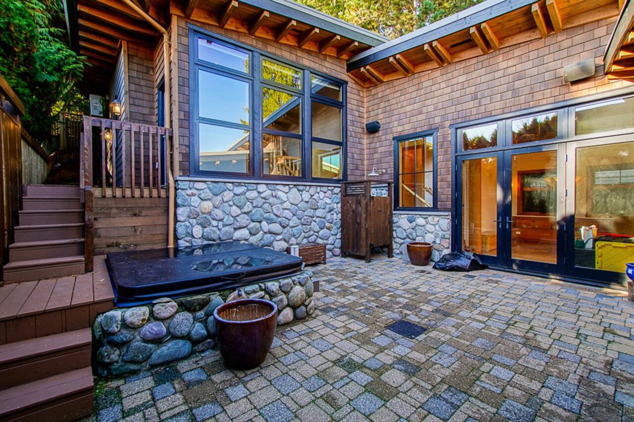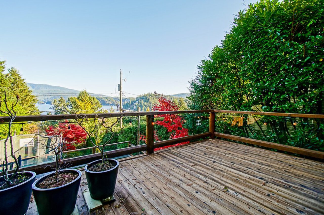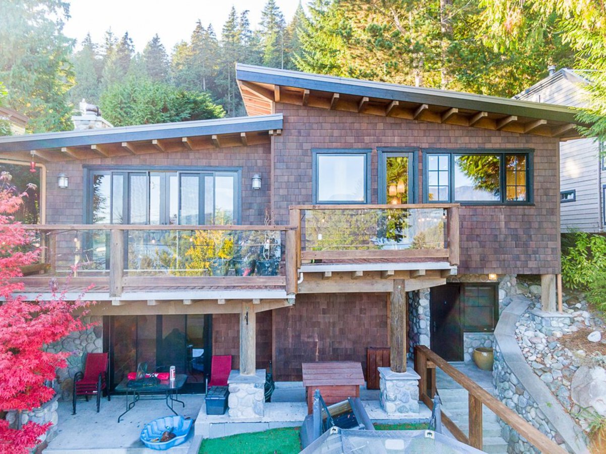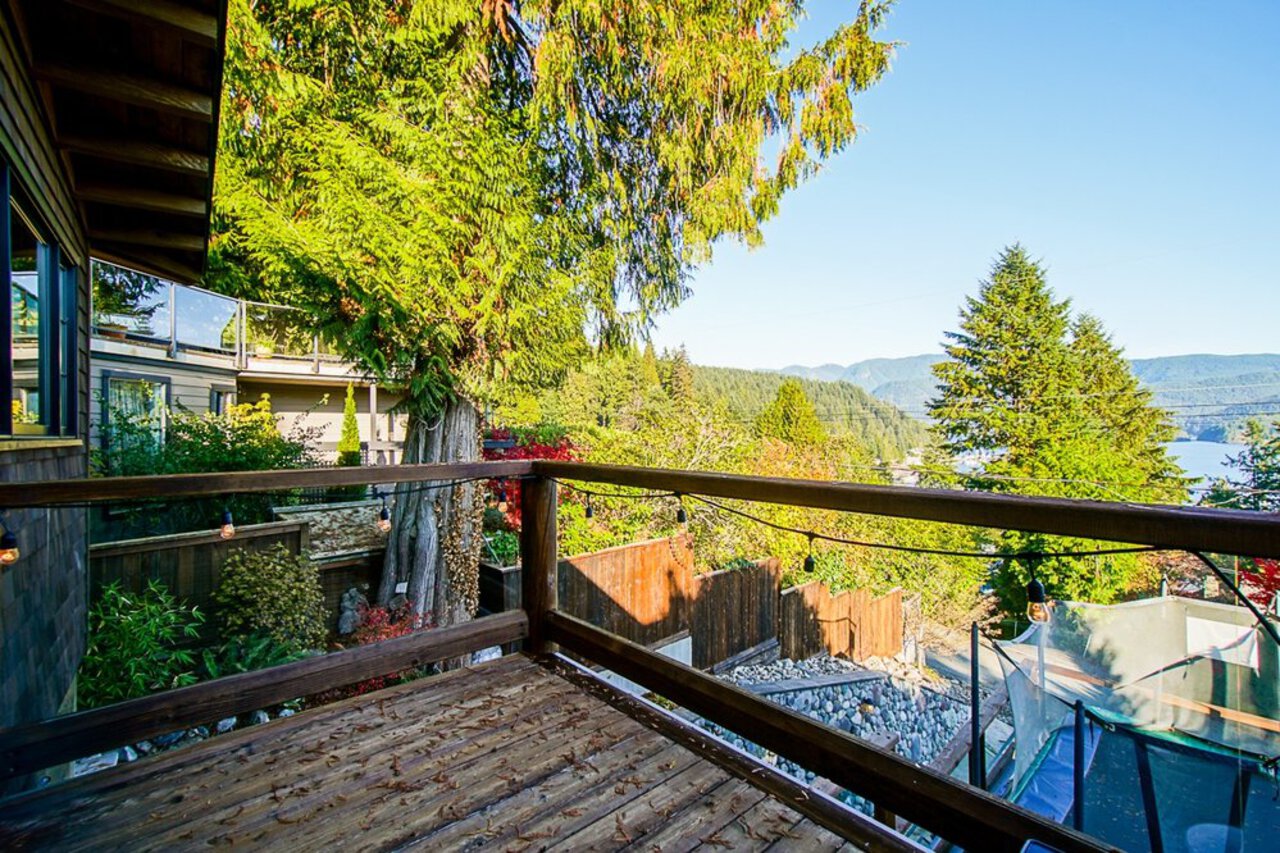 This custom built OCEAN VIEW home was completed in 2006,features 4 bedroom&3 bathrooms facing E towards Deep Cove Village. This home features an exposed open wood beam ceiling, 2 river rock wood burning fireplaces, gourmet kitchen with stainless steel appliances, gas range, island with granite counters, lots of custom built in cabinets and seating, a large balcony off the kitchen perfect for bbq&entertaining, gorgeous wood flooring, open plan living/dining, 3 bedrooms up, The Master with walk in closet and luxury ensuite facing the open courtyard with hot tub. Downstairs features another bedroom, 3 piece bathroom&family room with access to a large entertaining area outside above the garage. Bonus workshop down with 2 car garage, minutes to trails, Deep Cove Village, transit and the Beach.