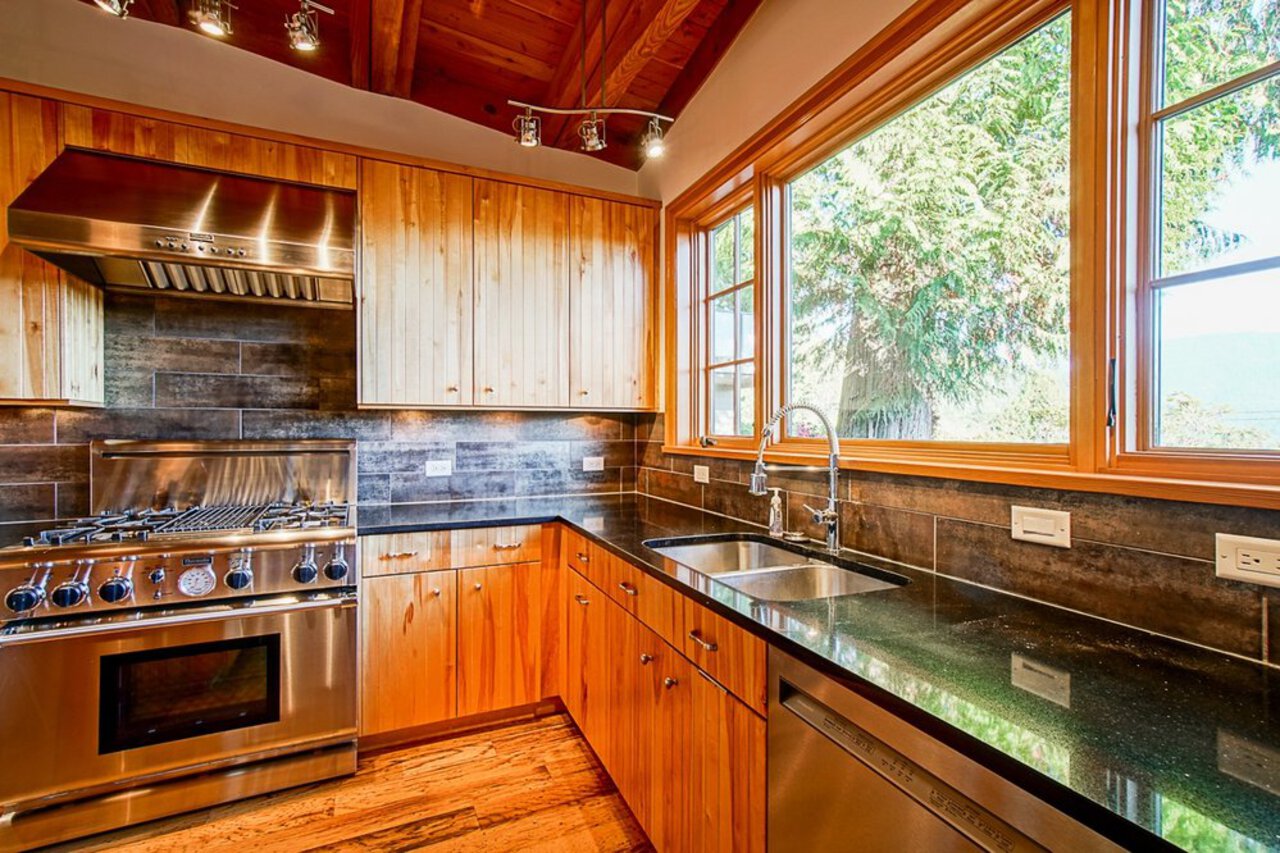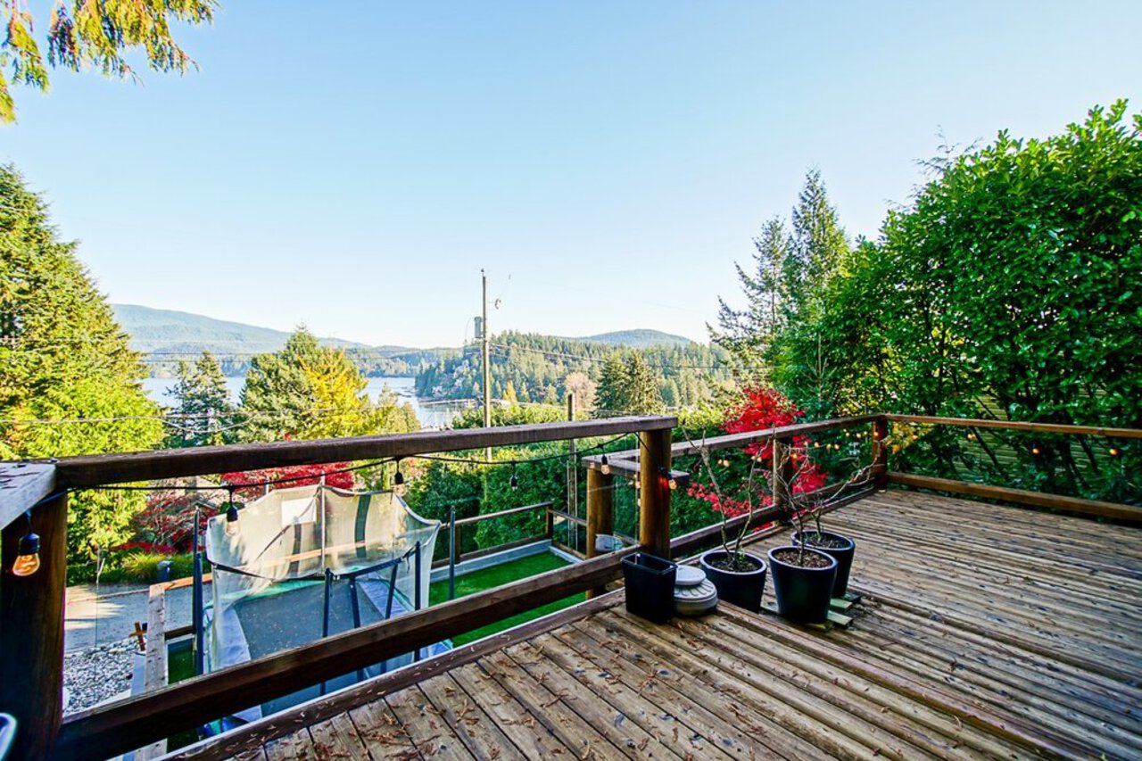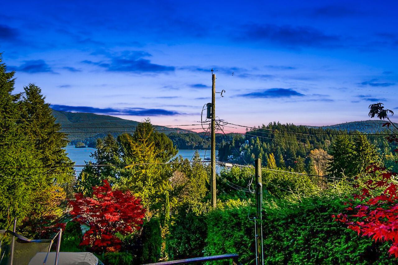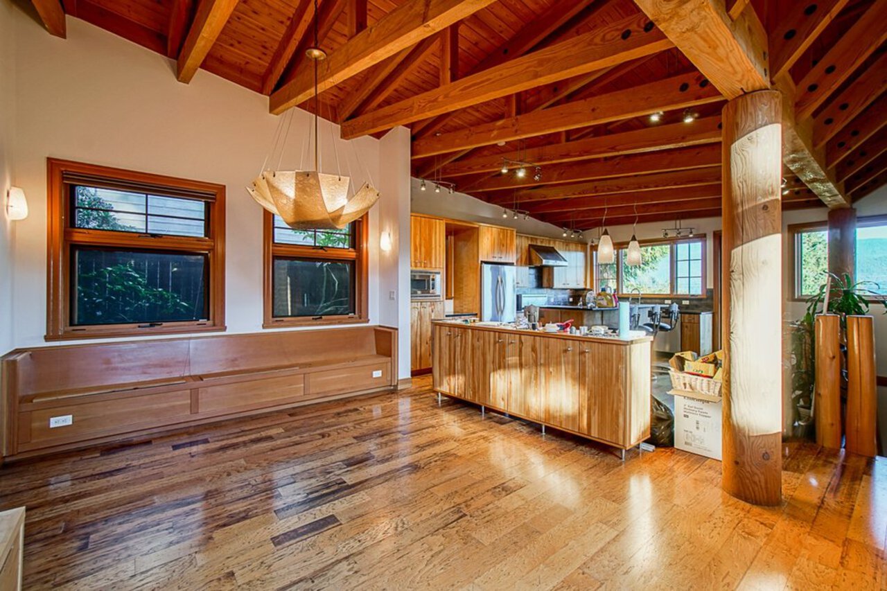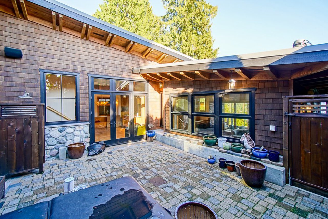 This custom built OCEAN VIEW home was completed in 2006,features 4 bedroom&3 bathrooms facing E towards Deep Cove Village. This home features an exposed open wood beam ceiling, 2 river rock wood burning fireplaces, gourmet kitchen with stainless steel appliances, gas range, island with granite counters, lots of custom built in cabinets and seating, a large balcony off the kitchen perfect for bbq&entertaining, gorgeous wood flooring, open plan living/dining, 3 bedrooms up, The Master with walk in closet and luxury ensuite facing the open courtyard with hot tub. Downstairs features another bedroom, 3 piece bathroom&family room with access to a large entertaining area outside above the garage. Bonus workshop down with 2 car garage, minutes to trails, Deep Cove Village, transit and the Beach.