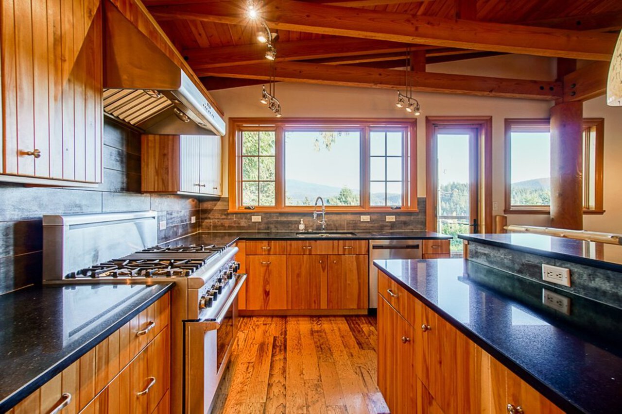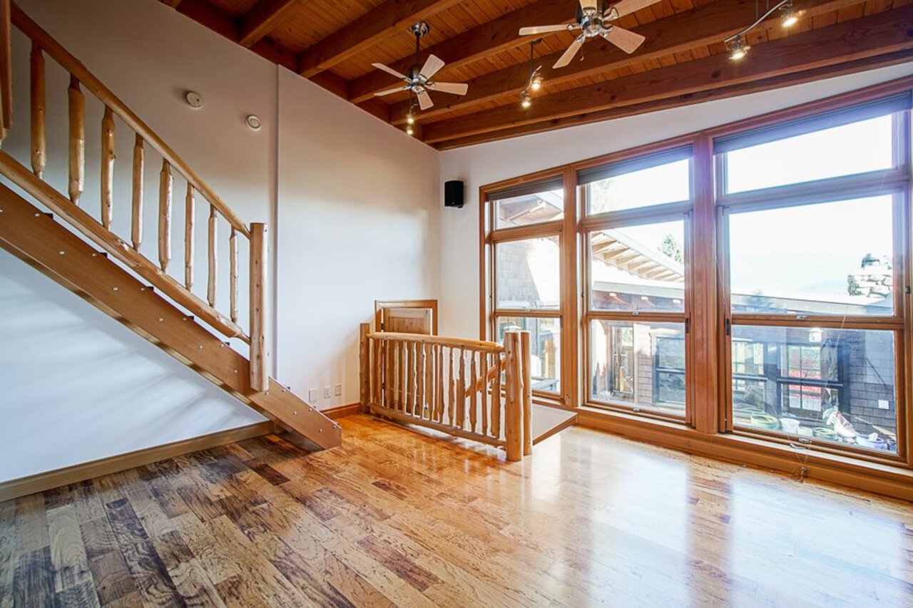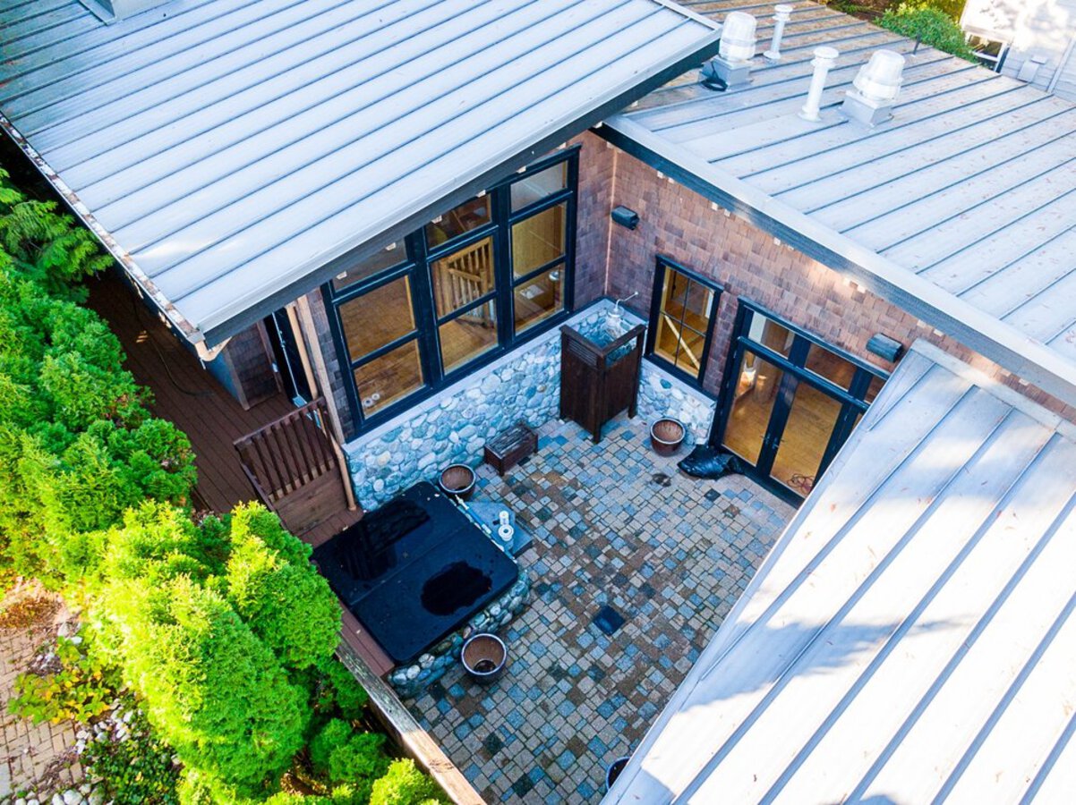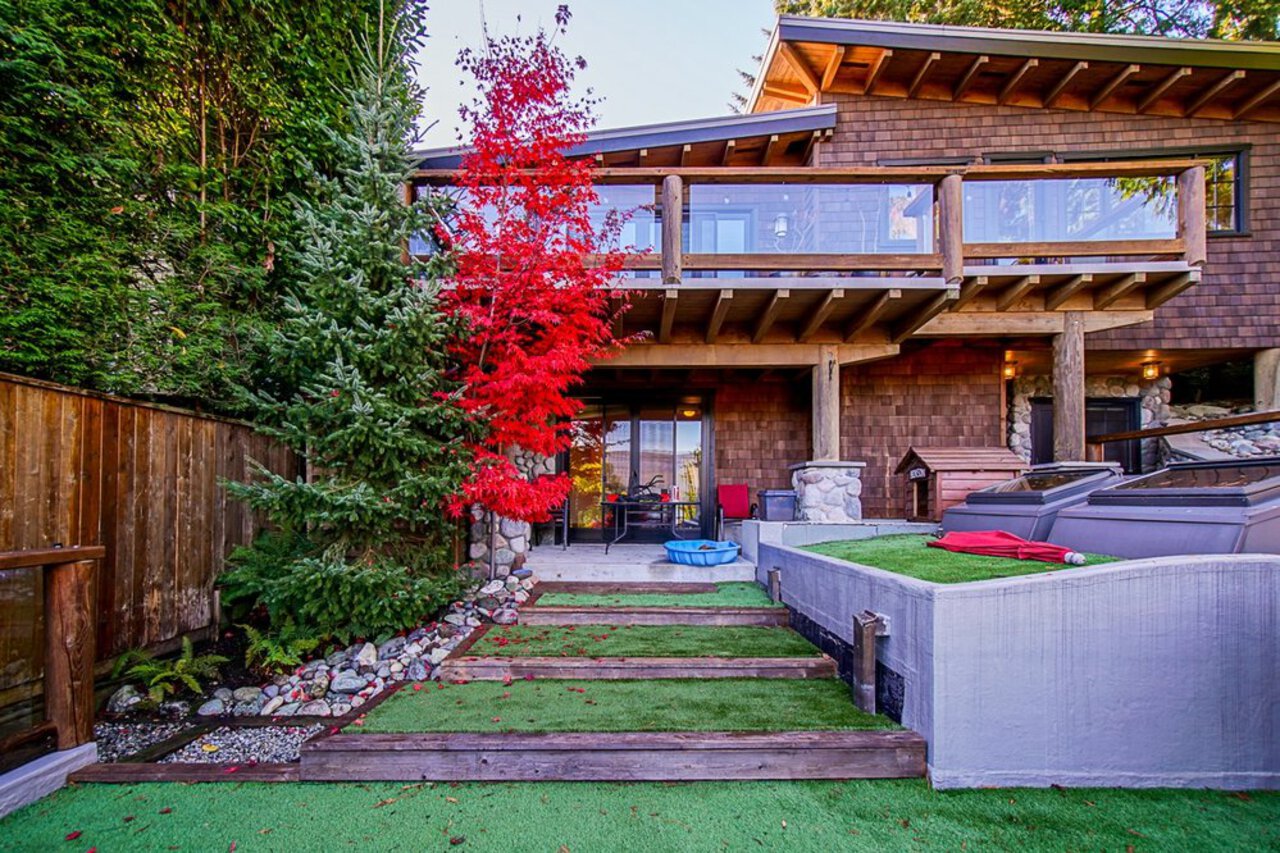 This custom built OCEAN VIEW home was completed in 2006,features 4 bedroom&3 bathrooms facing E towards Deep Cove Village. This home features an exposed open wood beam ceiling, 2 river rock wood burning fireplaces, gourmet kitchen with stainless steel appliances, gas range, island with granite counters, lots of custom built in cabinets and seating, a large balcony off the kitchen perfect for bbq&entertaining, gorgeous wood flooring, open plan living/dining, 3 bedrooms up, The Master with walk in closet and luxury ensuite facing the open courtyard with hot tub. Downstairs features another bedroom, 3 piece bathroom&family room with access to a large entertaining area outside above the garage. Bonus workshop down with 2 car garage, minutes to trails, Deep Cove Village, transit and the Beach.